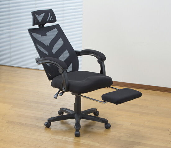メッシュリクライニングチェア フットレスト付き 長時間座っても負担の少ない、快適な座り心地 ●リクライニング機能、フットレスト、ヘッドレストがついておりますので、リラックスした座り心地を自分で作れます。